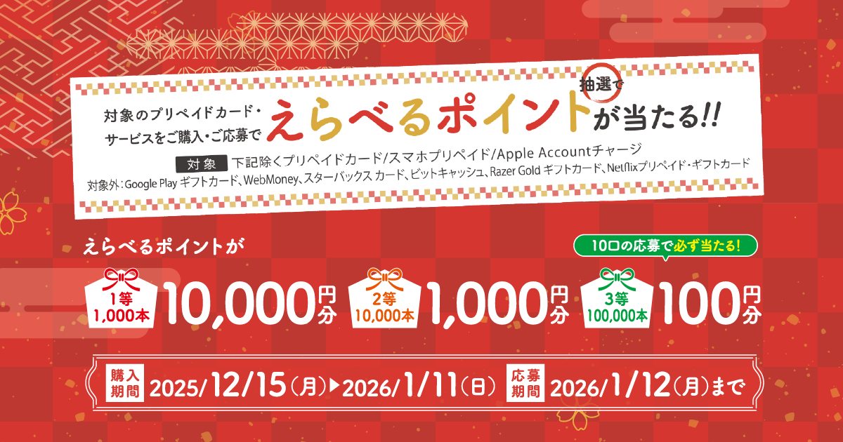 キャンペーン期間中、セブン‐イレブン各店舗にてマイページ登録のうえ対象のプリペイドカード・サービスを購入・応募すると、抽選で、えらべるポイントが当たる!