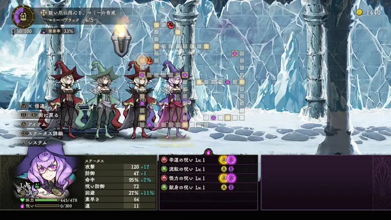 本作の重要な要素として「呪い」があり、敵の攻撃や探索のトラップなどでキャラが呪いを受けてしまうことがあります。呪いには攻撃力アップなどの良い効果や回避率ダウンなどの悪い効果が共存しており、常時発動されるバフデバフの形やターン開始時や攻撃を受けた際など、特定の状況下で発動するものもあります。