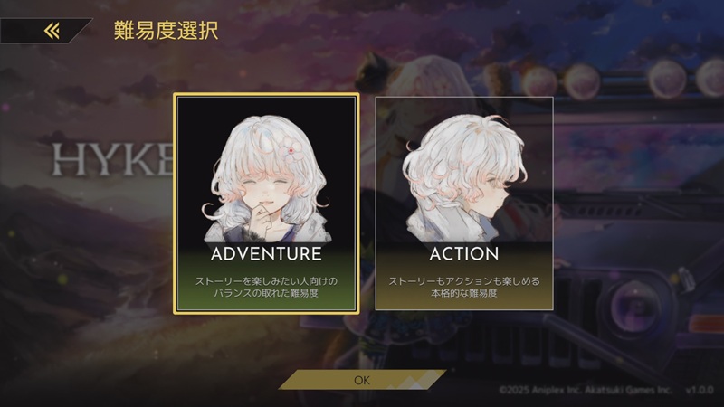 ゲームとしては大体ごり押しが効くので難しくはありませんが、一部使用キャラが制限されるサブクエストにやや難しいものがあるので、アクションに自信がない場合は「ADVENTURE」を選んでおいた方がいいかもしれません(ACTIONとの差ががどれほどあるかは確認していませんが…)