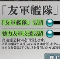 母港の「友軍艦隊」メニューより友軍艦隊を要請することが出来ます。詳しい仕様は以下の記事を参照。