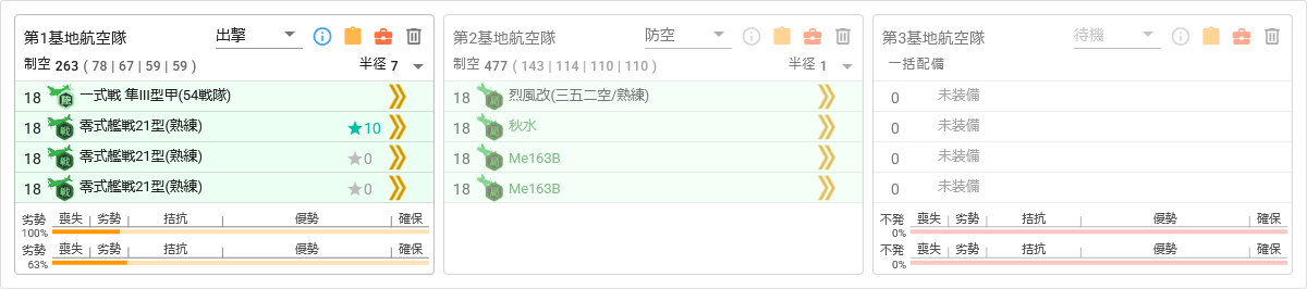 - Sマス優勢(丙・丁は均衡以上)となるよう調整。甲・乙では強編制の場合かなり敵制空値が高めなので、本隊のみで優勢が難しい場合は基地航空隊1部隊をSマスに使って敵制空値を削る必要があります