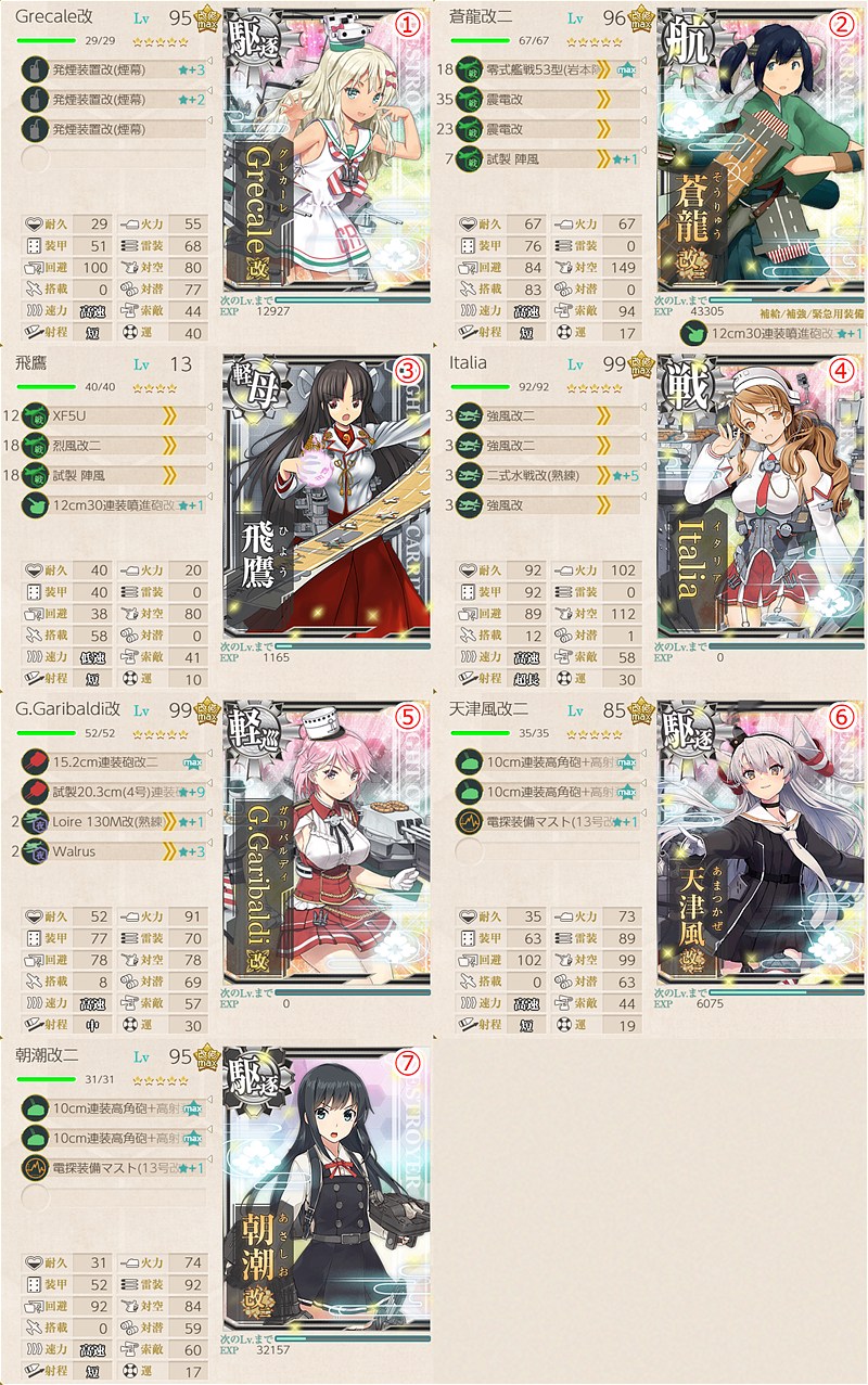 - 丙・丁は必要な制空値が低め。正規空母1隻だけで制空値が足りる場合は軽空母を重巡級や駆逐艦に変更しましょう(そうすればRマスを回避できます)