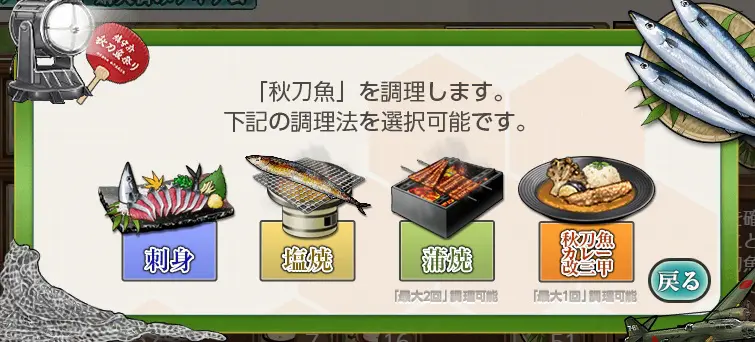 | 蒲焼 | 7尾 | 「秋刀魚の缶詰×1高速修復材×3」または「寒冷地装備&甲板要員」(2回まで交換可能) |