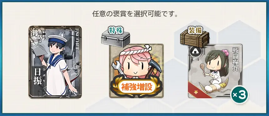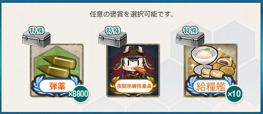 選択報酬は現状恒常入手の方法がなく、「天山一二型甲改二(村田隊/電探装備)」「零式水上偵察機11型甲改二」などの有用な装備が入手できる任務クリアに必要な「夜間熟練搭乗員」がおススメ。