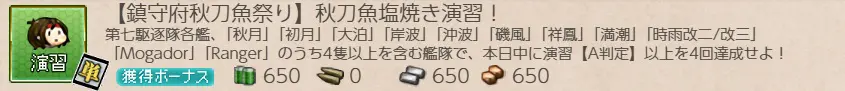 第七駆逐隊(「曙」「潮」「漣」「朧」)、「秋月」「初月」「岸波」「沖波」「磯風」「満潮」「時雨改二/改三」「Mogador」「大泊」「祥鳳」「Ranger」から4隻以上を含む艦隊で、同日中の演習で4回A勝利以上を達成するとクリア。