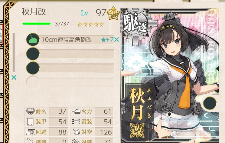 - 秋月型駆逐艦(「秋月」「照月」「涼月」「初月」「冬月」)のいずれかを旗艦に配置し、その第一スロットに10cm連装高角砲改(★+7以上)を装備
