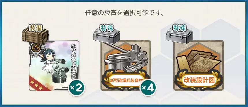 選択報酬は必要なもので。私は「戦闘詳報」「22号対水上電探改四×2」を貰いました。