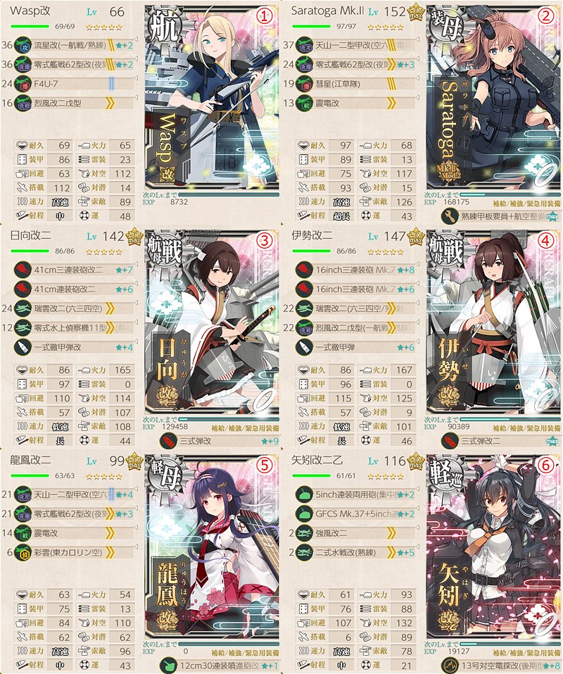 - レベル上げついでにWaspを採用、未改装の状態でも搭載数が大きいので大丈夫でした(特効補正的にはイントレピッドとサラトガのペアが良いです)