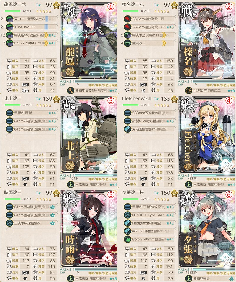 - 特効補正の関係で第一・第二両方に龍鳳を採用していますが、重要度は第二艦隊の方が高いので1隻しかいない場合は第一艦隊側は他の軽空母に(搭載数大きめなら誰でも良いです)