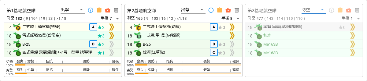 - 艦載機特効を意識した組み合わせに(特に空母はなるべくA・Bカテゴリの装備を1つずつは持たせる形に)
