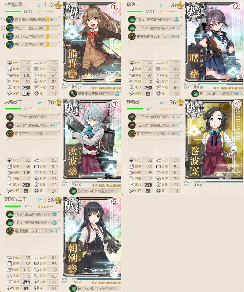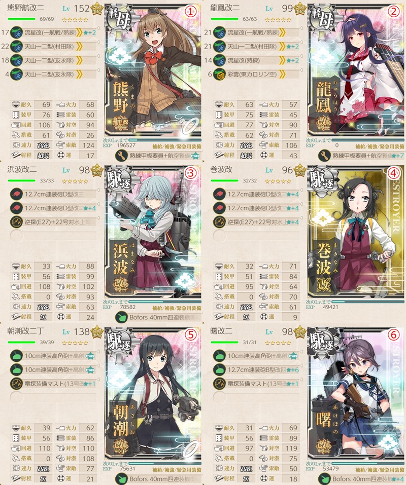 - 「巻波」「浜波」などの駆逐艦がいない場合は、そこの駆逐艦枠に任務条件の海防艦を編制。または軽空母を阿武隈にしてもOK(任務条件艦は全体で4隻いればOK)