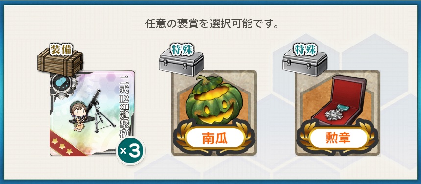 - 選択報酬『二式12cm迫撃砲改x3 / 南瓜 / 勲章』
