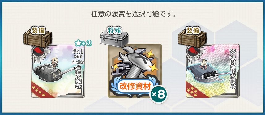- 選択報酬2『38.1cm Mk.I/N連装砲改★+2 / 改修資材×8 / 38cm四連装砲改』