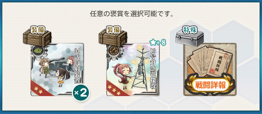 - 選択報酬1『94式高射装置×2 / 13号対空電探改(後期型)★+8 / 戦闘詳報』