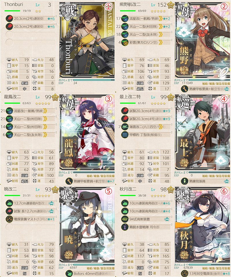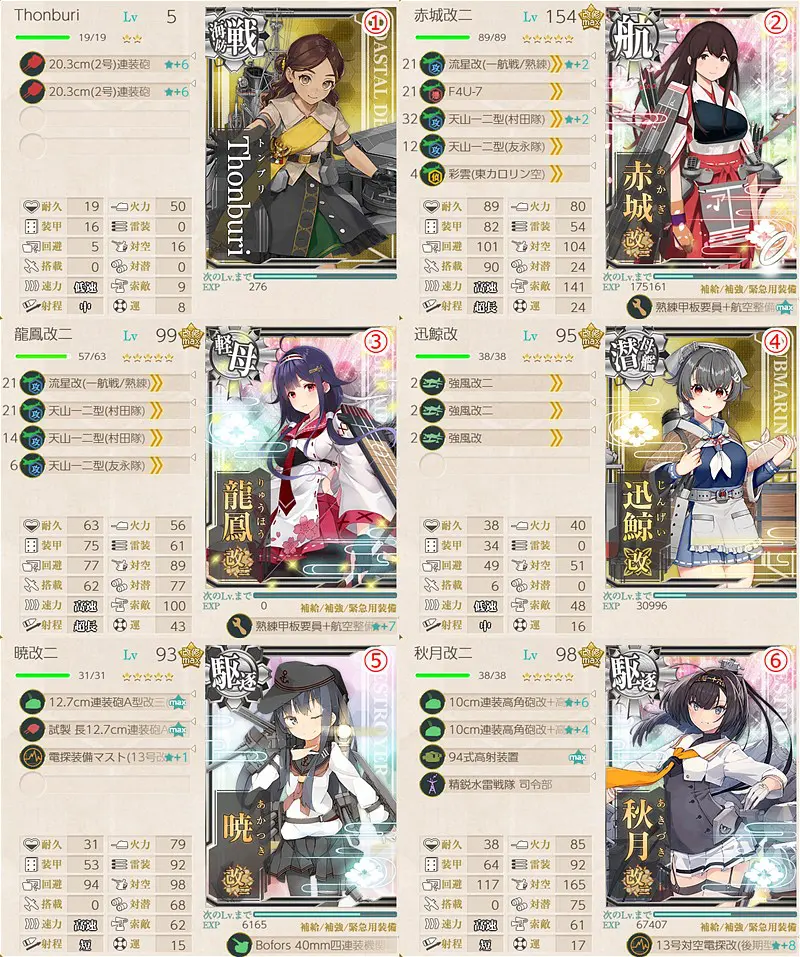 - 潜水母艦がいない場合は「Thonburi(旗艦)・正規空母1・軽巡1・水母1・駆逐2」「海防戦艦2(旗艦)・軽巡1・水母1・駆逐2」の形に