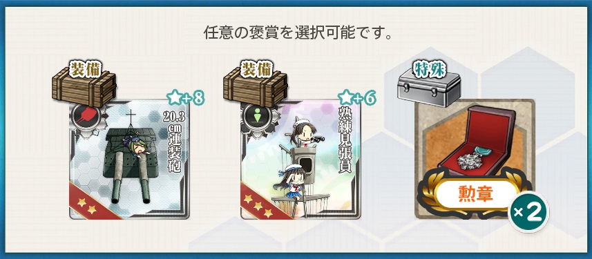- 選択報酬2『20.3cm連装砲★+8 / 熟練見張員★+6 / 勲章×2』