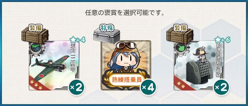 • 選択報酬2『天山一二型甲★+4×2 / 熟練搭乗員×4 / 12cm30連装噴進砲★+6×2』