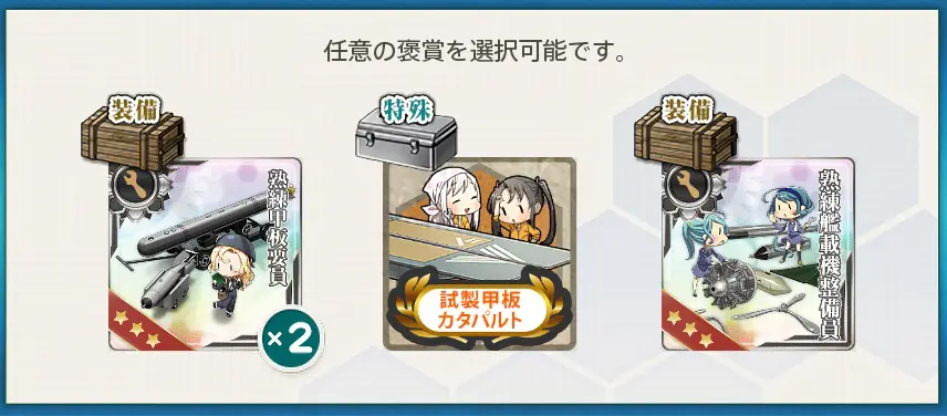 - 選択報酬『熟練甲板要員×2 / 試製甲板カタパルト / 熟練艦載機整備員』