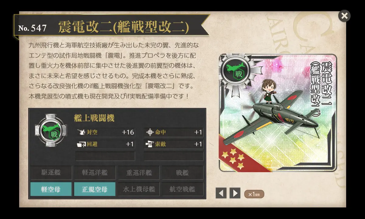 - 震電改二(艦戦型改二)は対空16と任務実装時点では一番制空値を稼げる艦戦となります