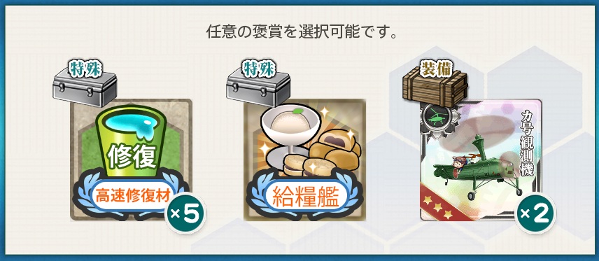 - 選択報酬『高速修復材×5 / 給糧艦「間宮」 / カ号観測機×2』