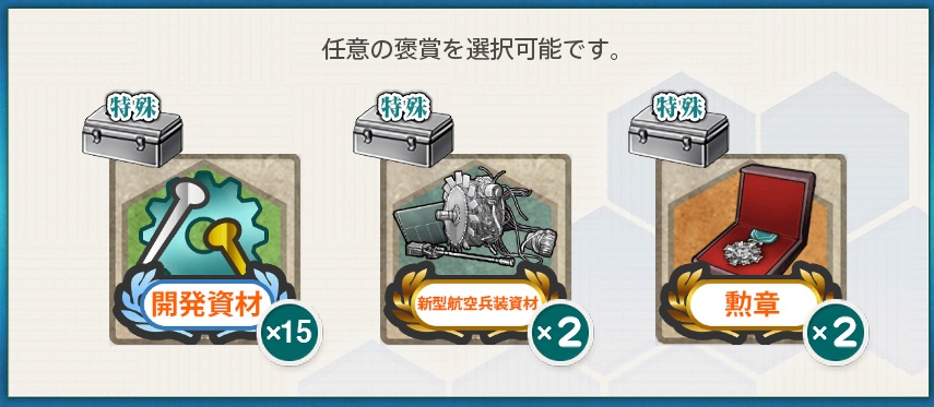 - 選択報酬『開発資材×15 / 新型航空兵装資材×2 / 勲章×2』