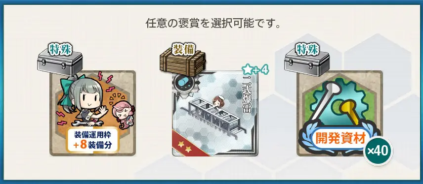 • 選択報酬1『装備運用枠+8 / 二式爆雷★+4 / 開発資材×40』