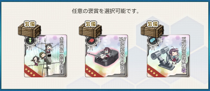 • 選択報酬2『水雷戦隊 熟練見張員 / 12.7cm連装砲D型改三 / 三式爆雷投射機改』