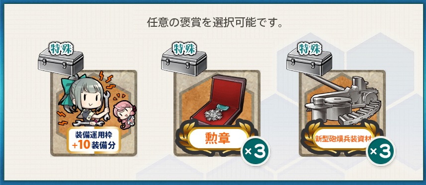 - 選択報酬1『装備運用枠+10装備分 / 勲章x3 / 新型砲熕兵装資材×3』