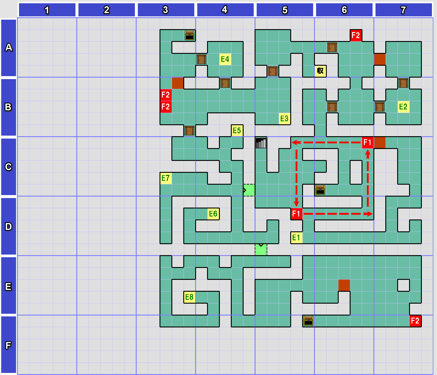 - F1[a4]、F2[a1]の宝箱を回収するには、マップ画像の赤いラインの道を通る必要がある