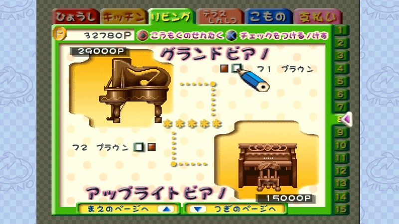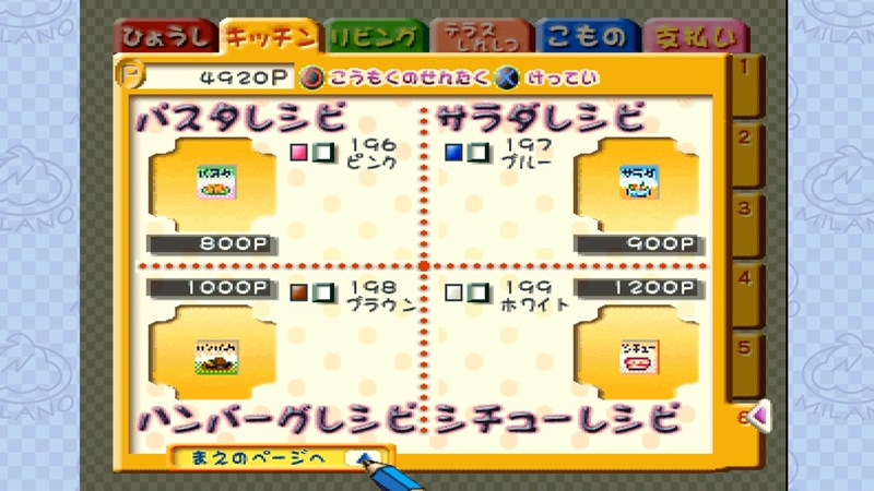 - アルバイトでお金を貯めて「テレビ(3,800Pのミニミニテレビなど)」「ステレオ(2,400Pのロボコンポ)」「植物(250Pのにょろりそうのはちなど)」「レシピ4種類(パスタレシピ、サラダレシピ、ハンバーグレシピ、シチューレシピの計3,900P)」「グランドピアノ(29,000P)」を順次購入