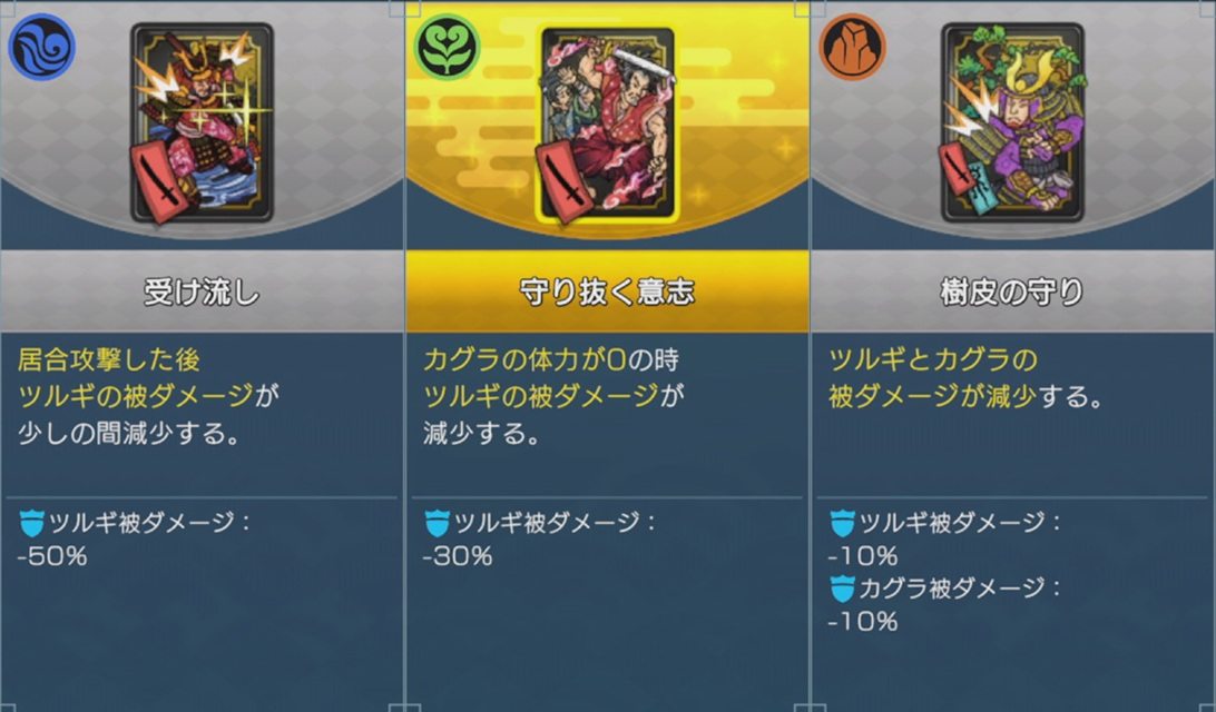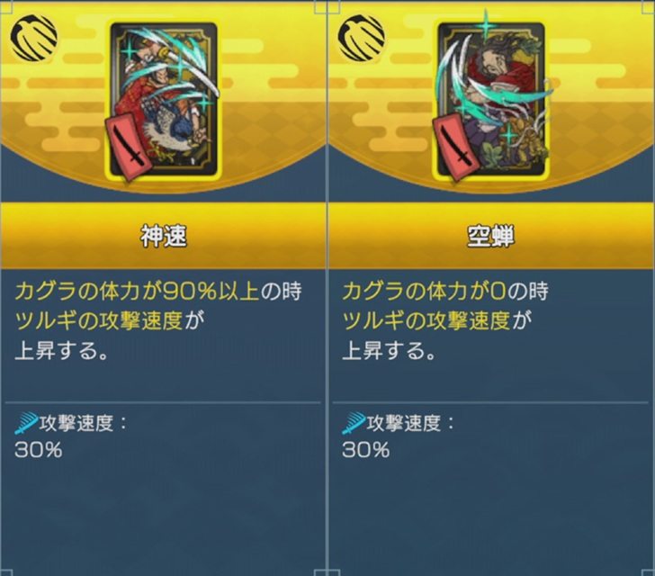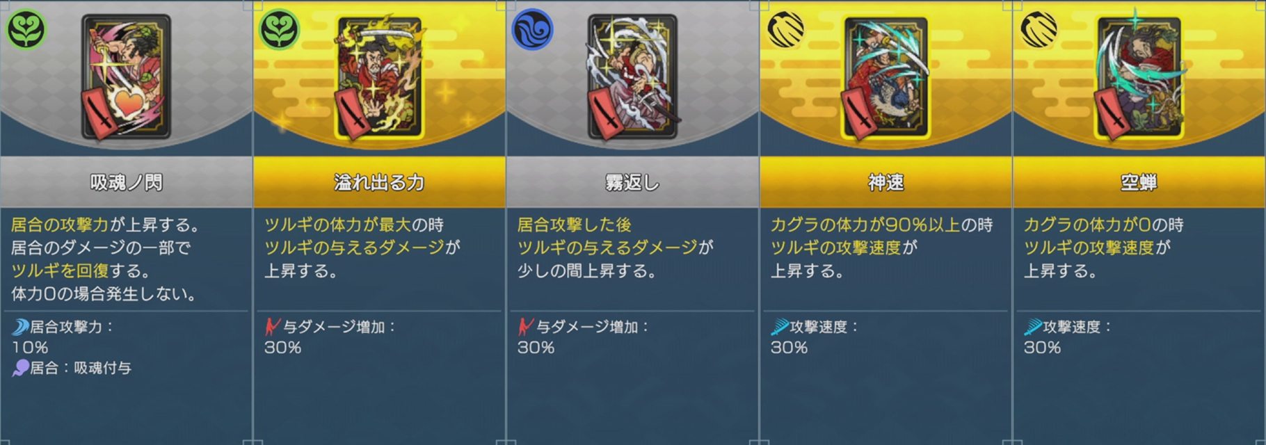 - カグラの体力が90%以上/0の時にツルギの攻撃速度上昇