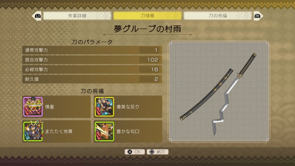 - 耐久値1の刀を用意(初期耐久値によっては全部大成功ではなくわざと1回成功するなどして調整)