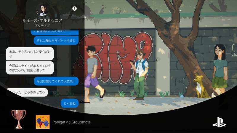 通りを進んでいくとルイーズからスライドに関するメッセージが来るので、(「じゃあ」「ほんと言うとやってない」)の選択肢で「じゃあ」を選ぶ