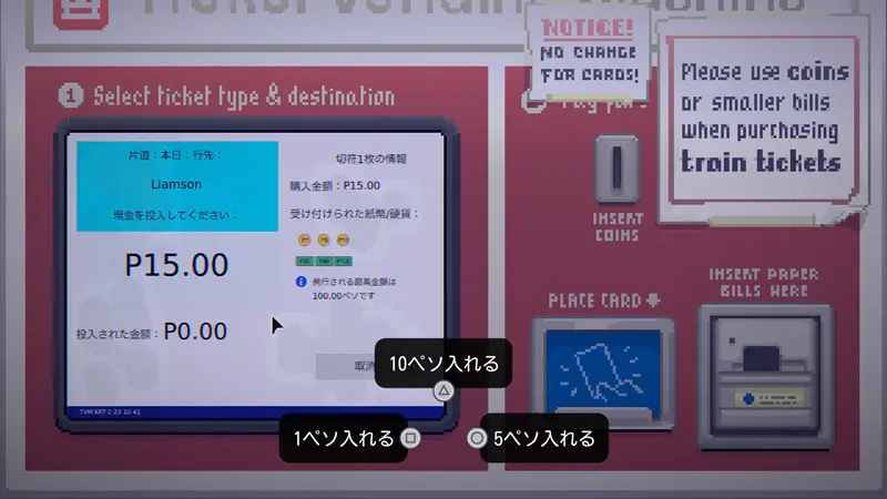 券売機で15ペソ支払う際に「1ペソ入れる」を15回選ぶ