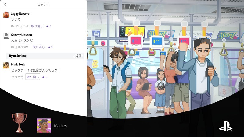 ジープニーの中でコインを渡すミニゲームで全部失敗するとトロフィー「1-2-3」、全部成功すると「Basta Driver, Sweet Lover」を獲得できます。リズムを覚えて×ボタンを正しいタイミングで押すと車掌にコインを渡すことが出来ます。失敗するとゴミ箱行き。